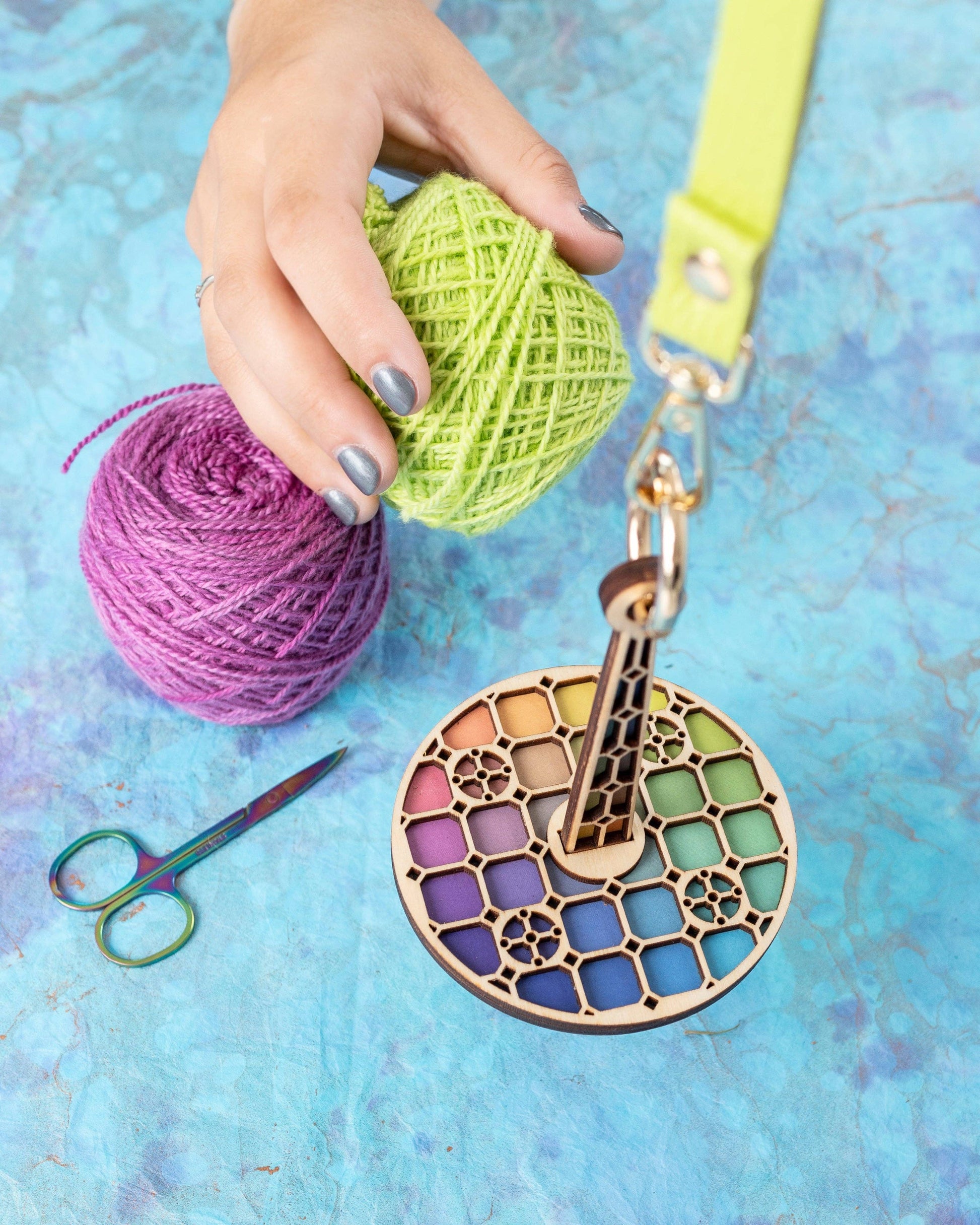 Meet the Mini Minder (USPTO Patent Pending), a wrist yarn holder designed for knitters and crocheters. Say goodbye to tangled yarn and lost balls! Just stick your yarn on the Mini Minder and wear it on your wrist or clip it to your bag. The Mini Minder lets you enjoy hassle-free stitching wherever you go!