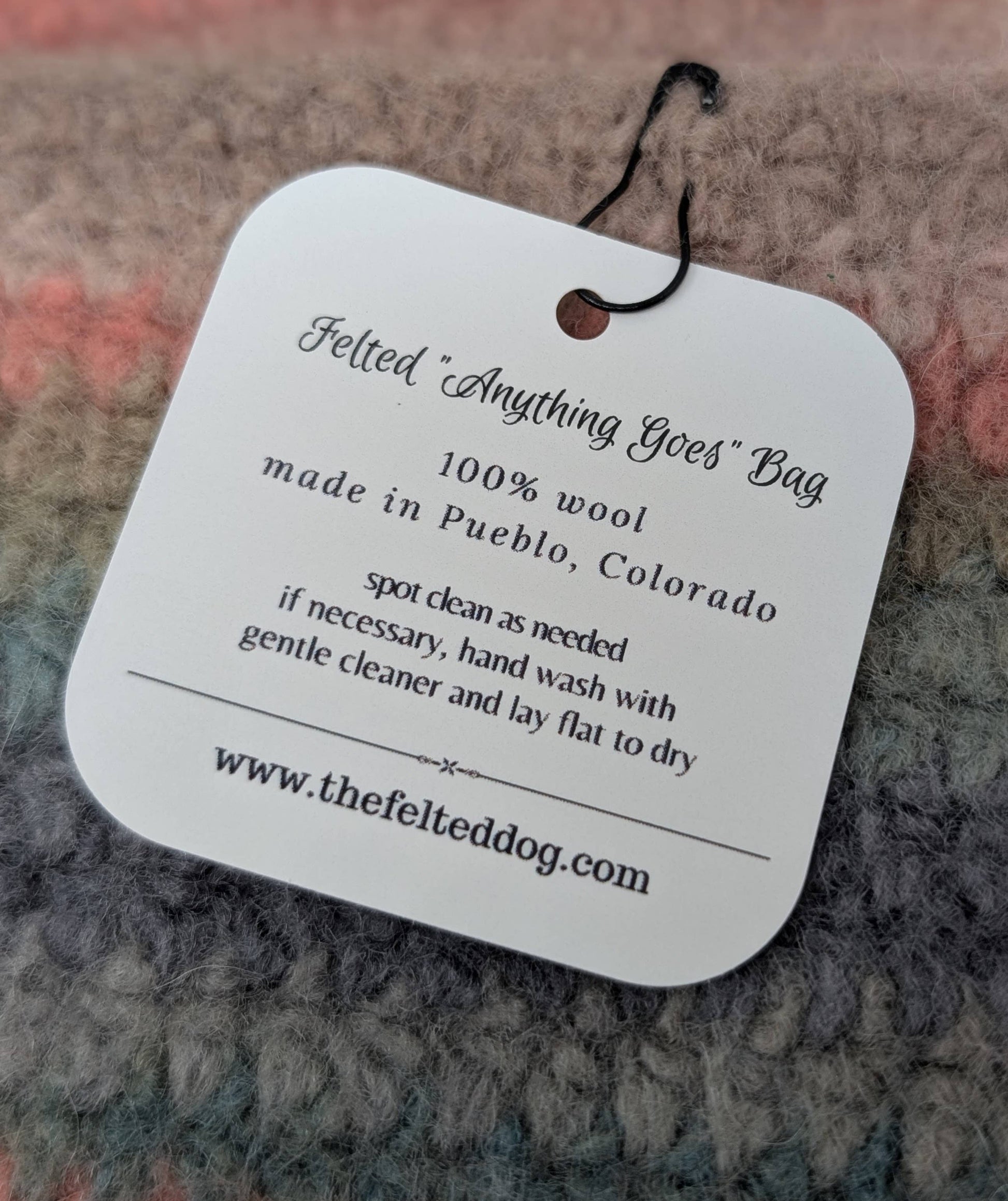 Introduce your customers to the delightful versatility of our classic "Anything Goes" felted wool bag. This small, charming pouch is meticulously handcrafted – first crocheted, then carefully felted – using 100% wool. The result is a uniquely textured, durable, and eco-conscious accessory with undeniable artisan appeal.